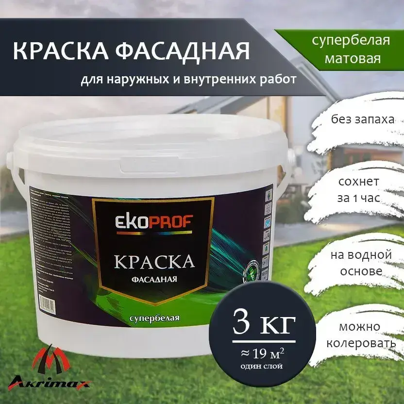 Краска Фасадная Akrimax 3 кг, атмосферостойкая влагостойкая для наружных и внутренних работ, без запаха, быстросохнущая, водно-дисперсионная, акриловая, матовое покрытие, белый