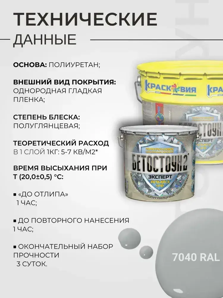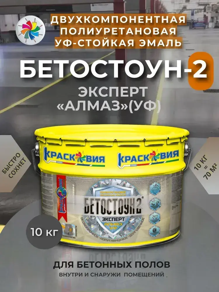 Краска по бетону Бетостоун-2 Эксперт Алмаз УФ, полиуретановая эмаль, износостойкая, УФ-стойкая, RAL 7040, 10кг.