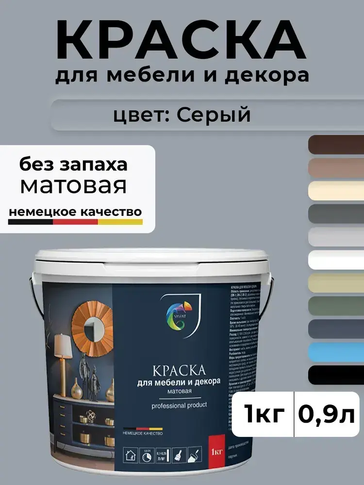 Краска SYIFAT М6 0,9л Цвет: Серый Для мебели и декора Акриловая Матовая Моющаяся Без запаха Быстросохнущая Стойкая Универсальная Для кухонных фасадов
