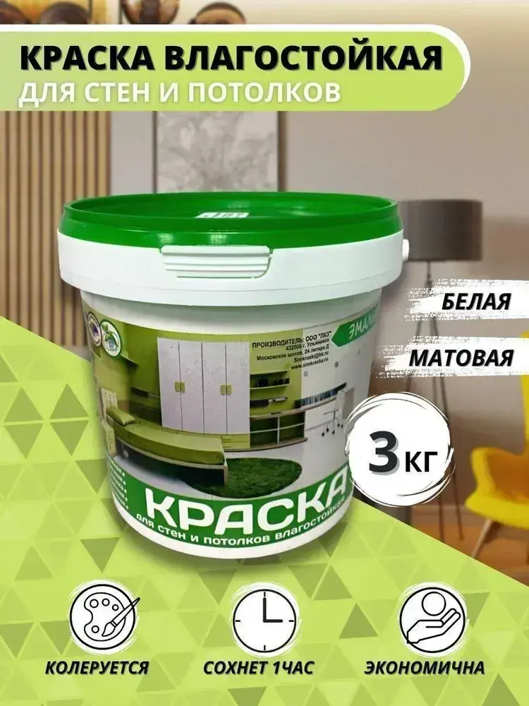 Краска ВД Эмальер Для Стен и Потолков влагостойкая белоснежная 3 кг