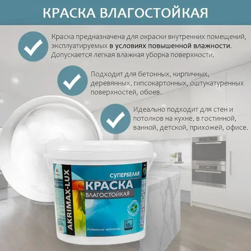 Краска Влагостойкая акриловая супербелая 7 кг AKRIMAX для помещений с повышенной влажностью, для стен, для кухонь, для ванных комнат, Матовое покрытие, белый