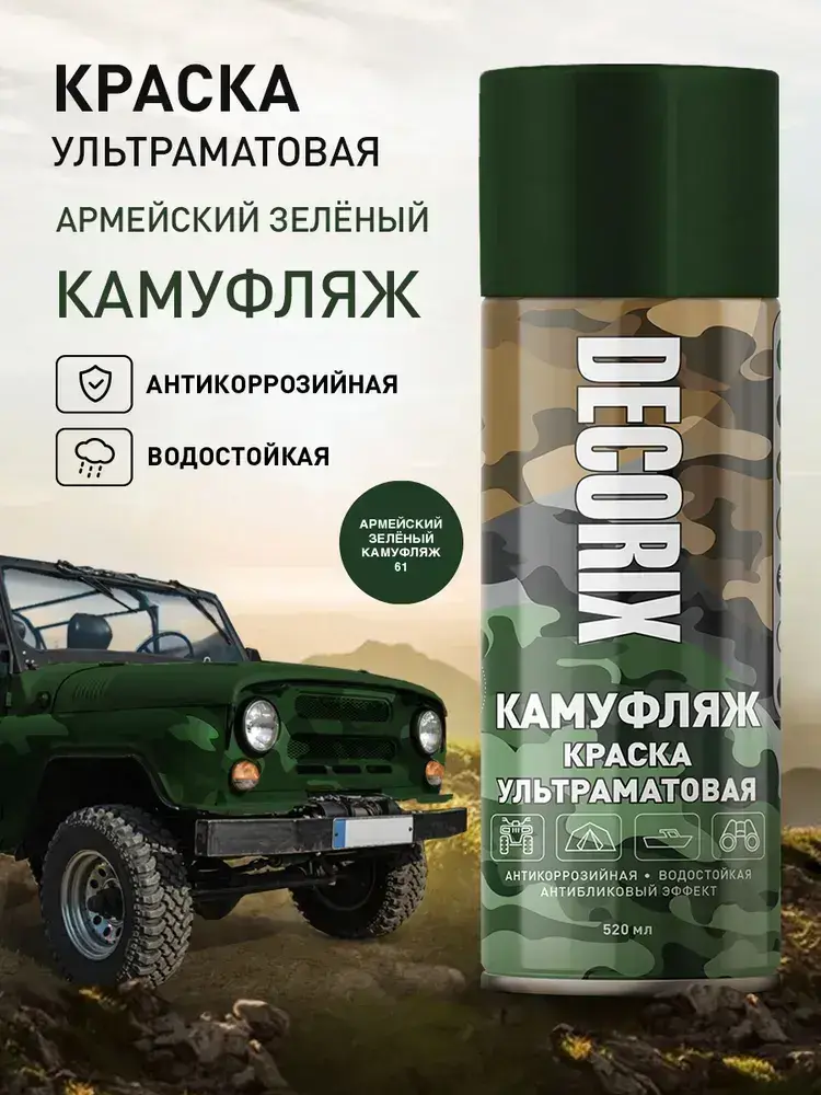 Краска зеленая камуфляжная аэрозольная матовая DECORIX - светопоглощающая краска Зеленый камуфляж в баллончике 520 мл