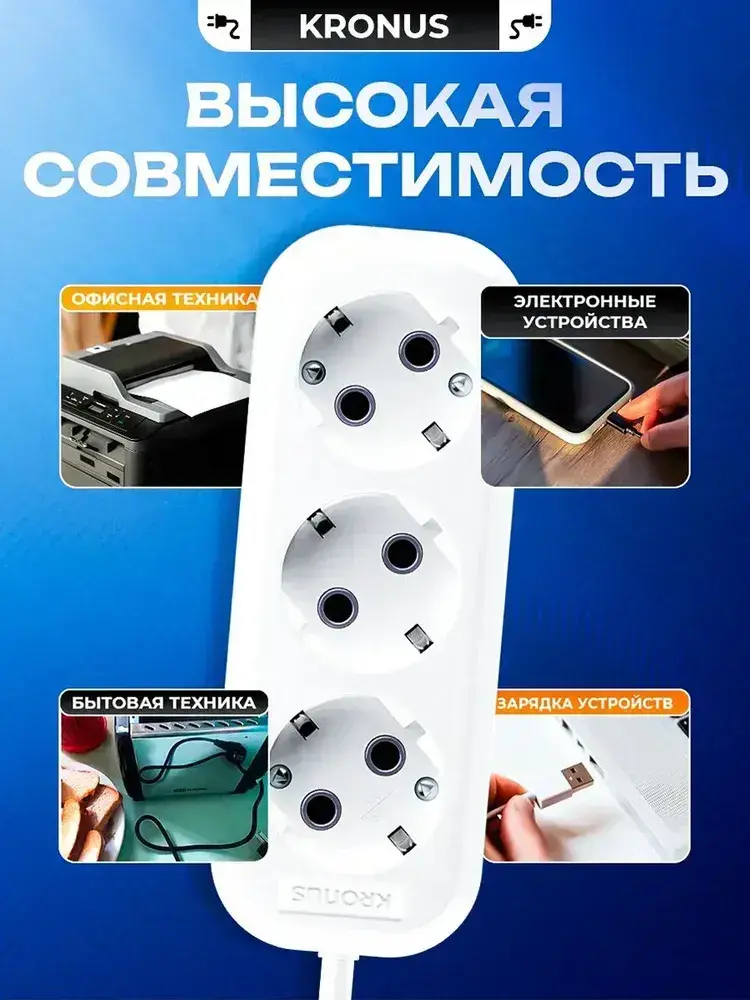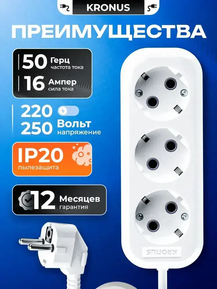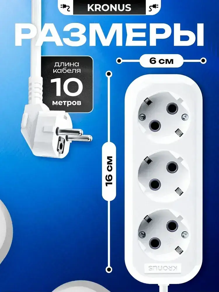 Kronus Удлинитель сетевой 10 м 3 розетки с заземлением