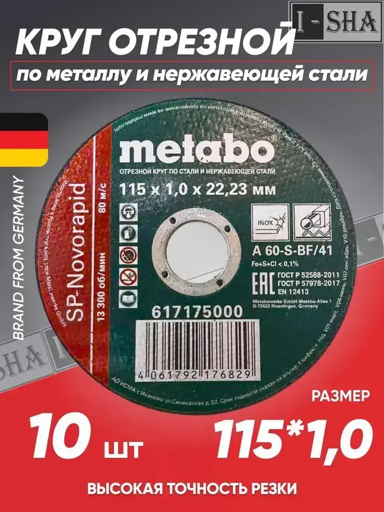 Круг отрезной по металлу 115*1.0 Metabo, 10 шт