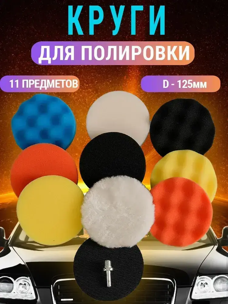 Круги полировальные для авто и фар на липучке 125мм для УШМ и шуруповерта 11 предметов AIDELIFE