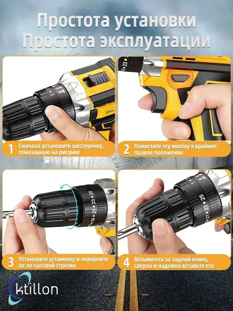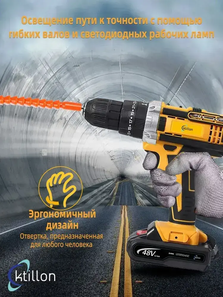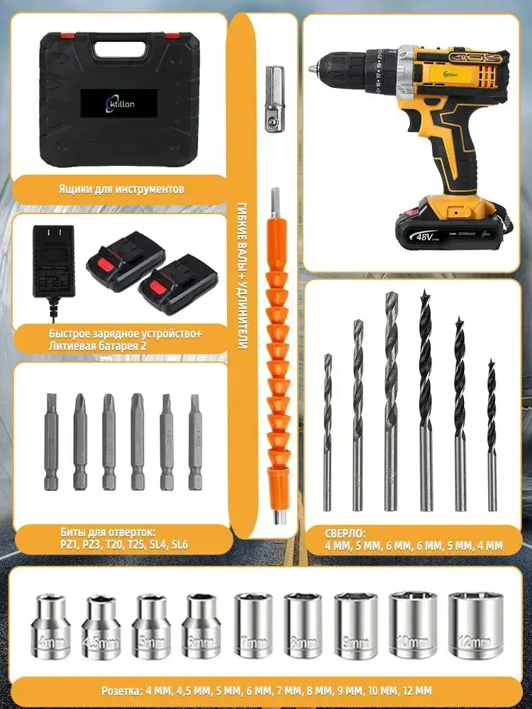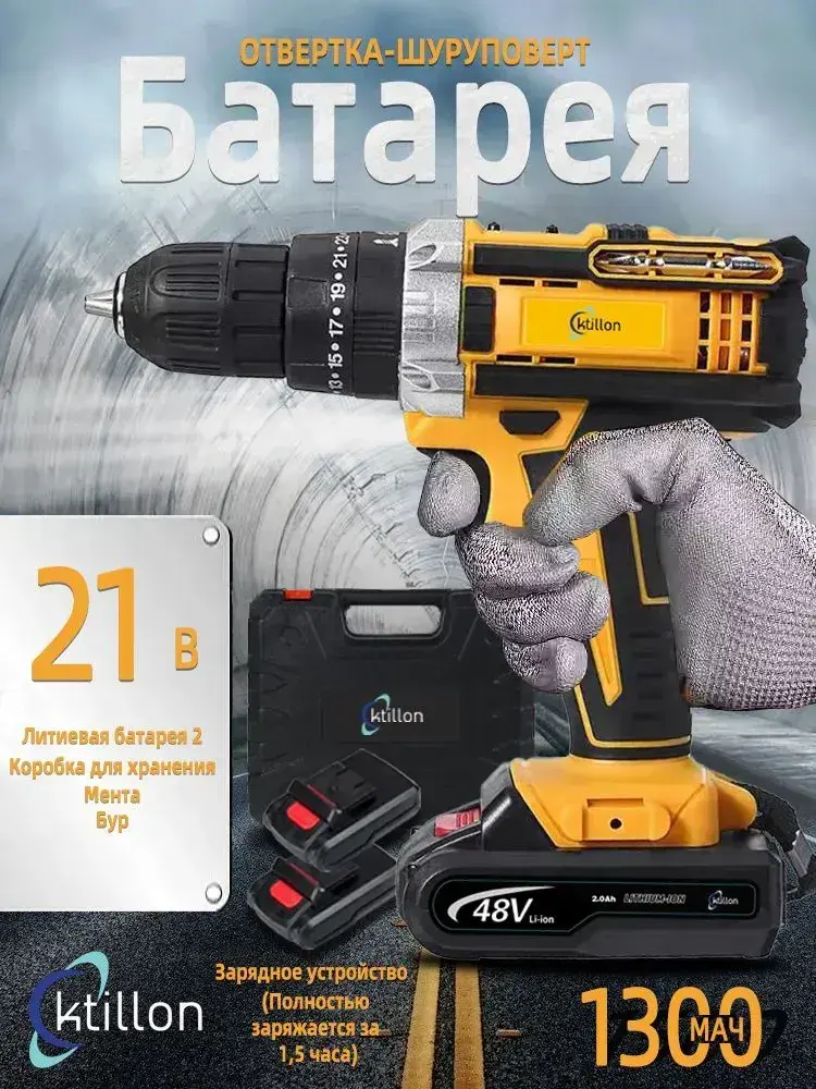 Ktillon Ударная дрель шуруповерт аккумуляторная, с кейсом + набор бит и свёрл, 2 АКБ, 48 В,24 насадки и инструкция в наборе