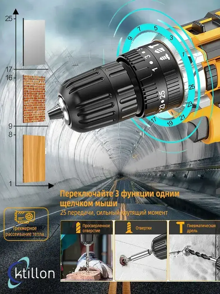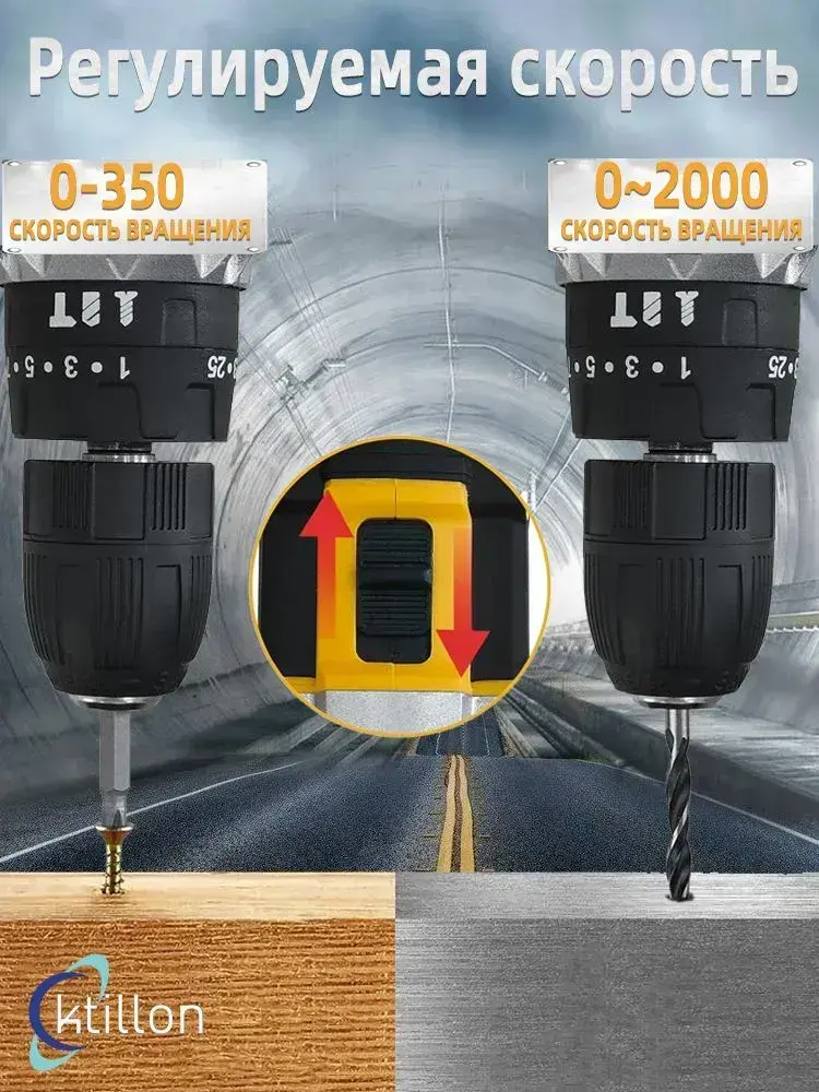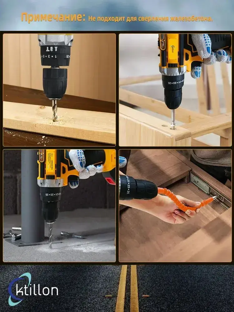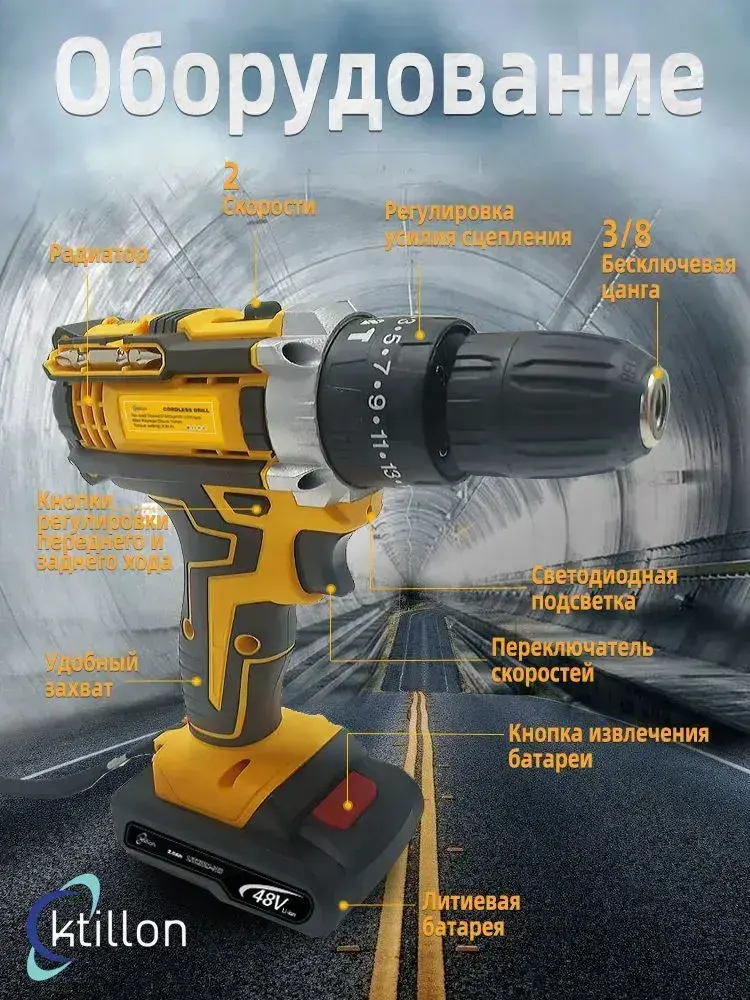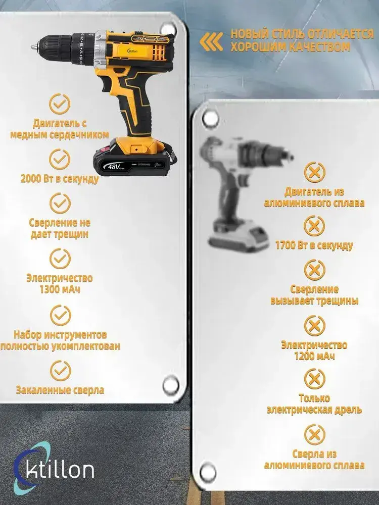 Ktillon Ударная дрель шуруповерт аккумуляторная, с кейсом + набор бит и свёрл, 2 АКБ, 48 В,24 насадки и инструкция в наборе