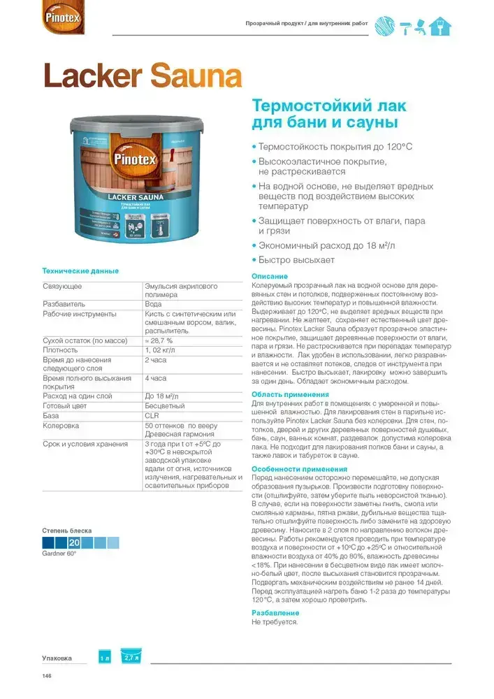 Лак для бань и саун на водной основе Pinotex Lacker Sauna 20 полуматовый 1 л.