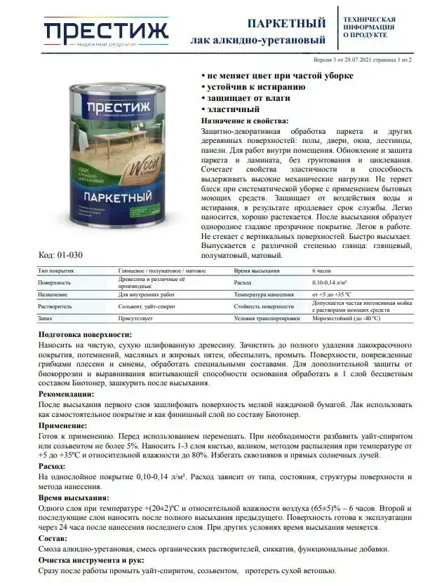 Лак Паркетный ГЛЯНЦЕВЫЙ 0.9 кг ПРЕСТИЖ алкидно-уретановый для дерева