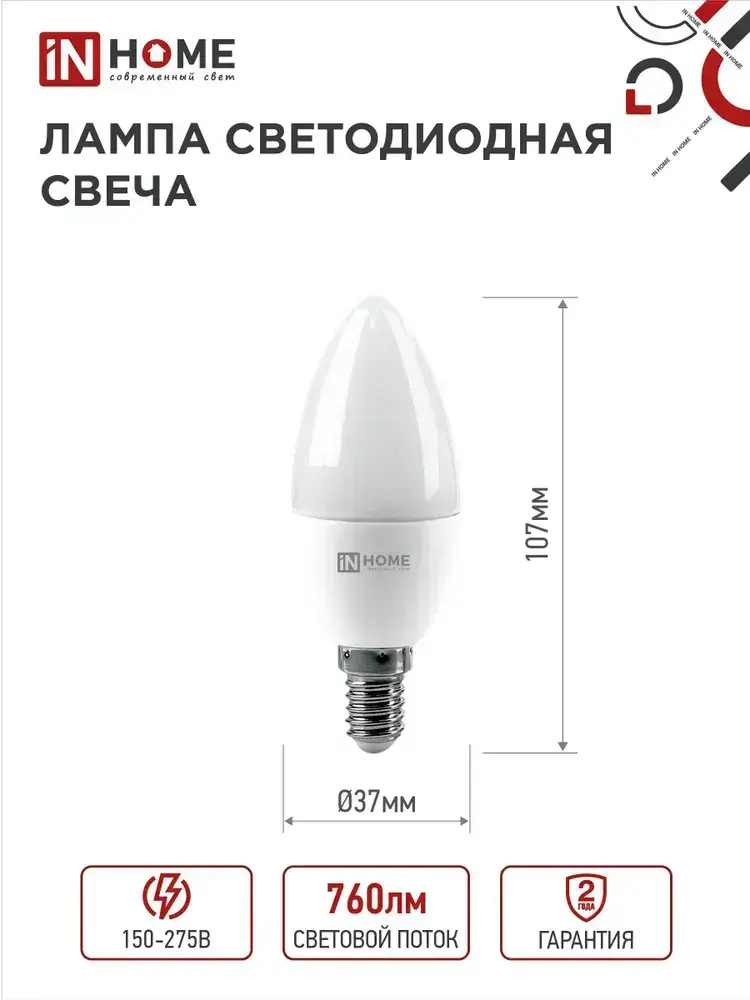 Лампочка светодиодная Е14 свеча 8Вт нейтральный белый 4000К 760Лм упаковка 4шт. IN HOME