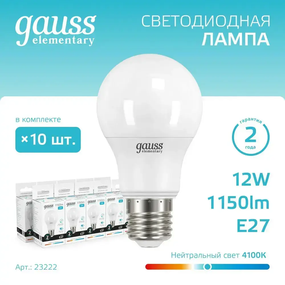 Лампочка светодиодная Е27 Груша 12W 4100К нейтральный-белый свет УПАКОВКА-10 шт. Gauss Elementary