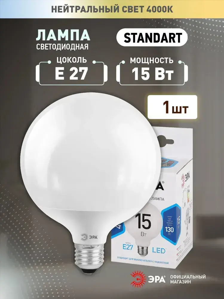 Лампочка светодиодная ЭРА STD LED G95-15W-4000K-E27 E27 / Е27 15Вт шар нейтральный белый свет