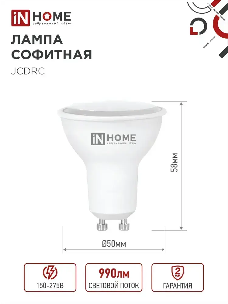 Лампочка светодиодная GU10 11W холодный свет 6500K 990Лм упаковка 4 шт. IN HOME