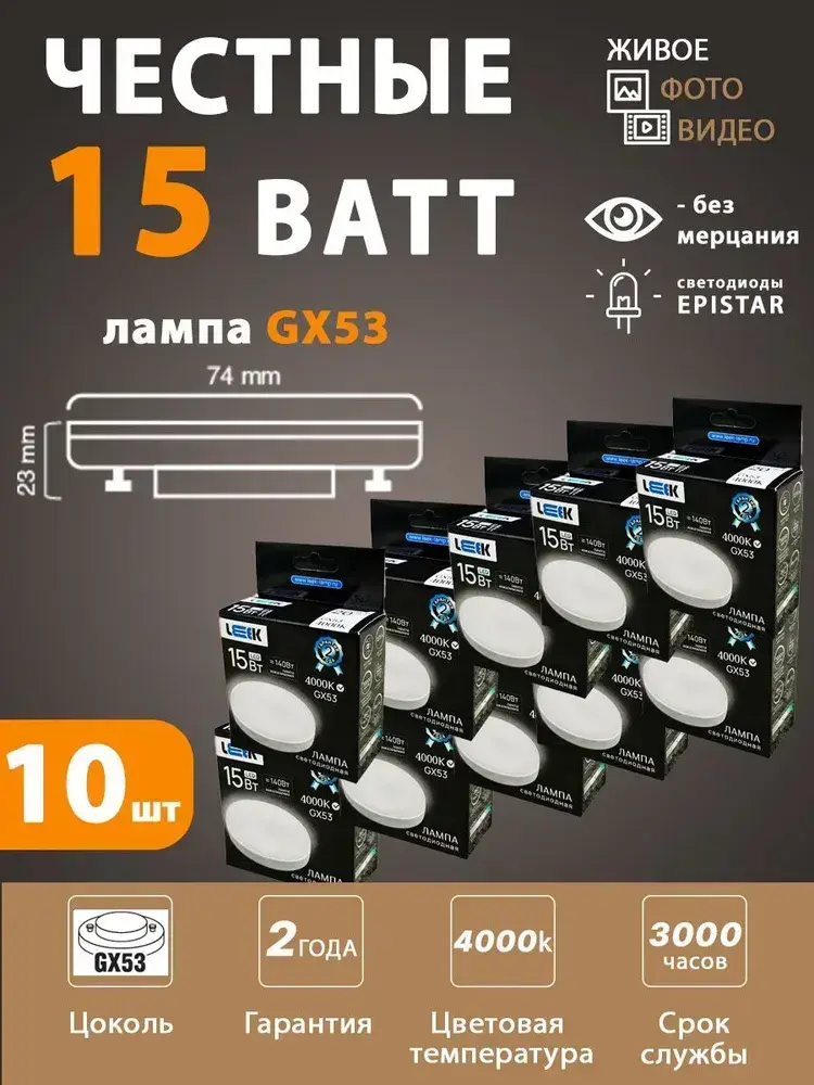 Лампочка светодиодная GX53 15 ватт 4000K Leek (комплект 10 шт) средний нейтральный свет