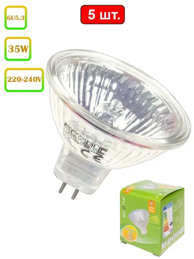 Лампочка, Цоколь:GU5.3, 35 Вт, Галогенная, 5 шт.