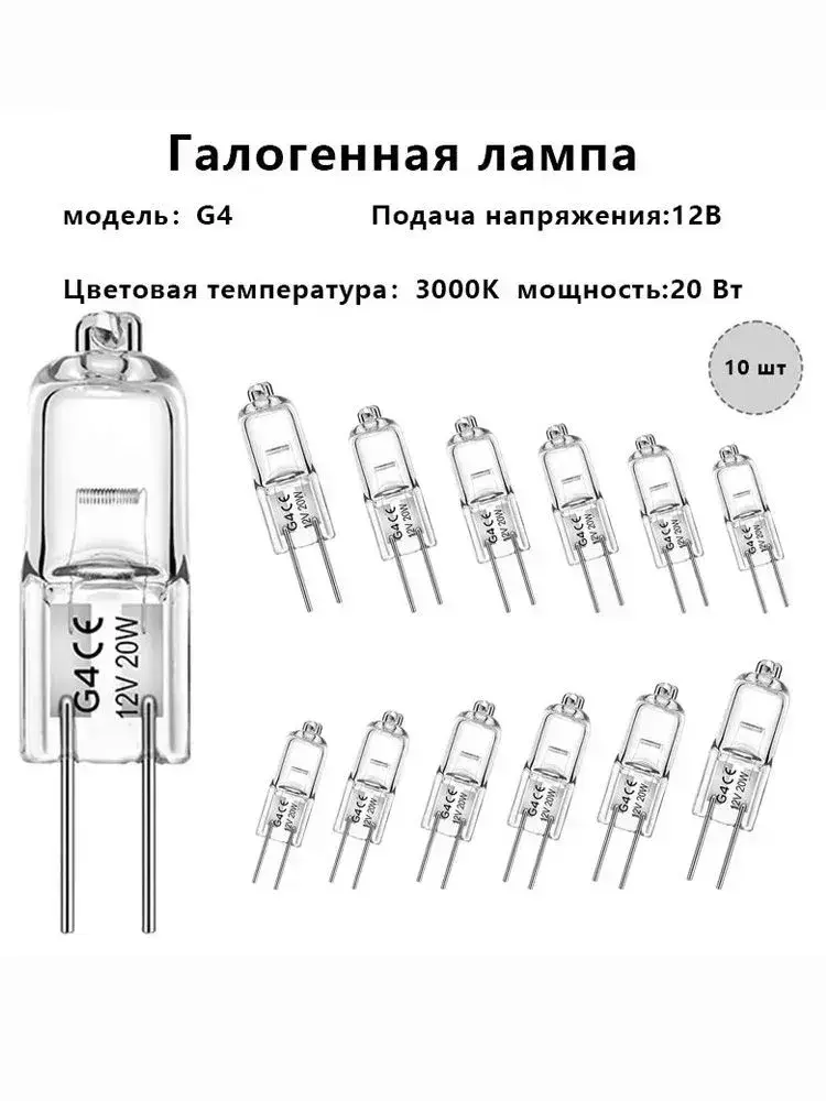 Лампочки галогенные G4 20W 12V premium, лампы галогеновые для люстр, вытяжки, с цоколем 12 В вольт 20 вт ватт,10 шт.