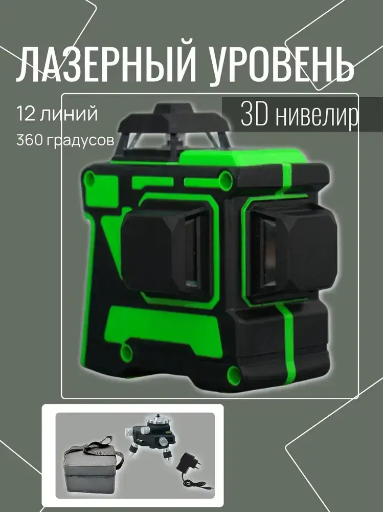 Лазерный уровень / нивелир Hilda 360 градусов 3D /12 линий, зеленый луч без магнитного крепления