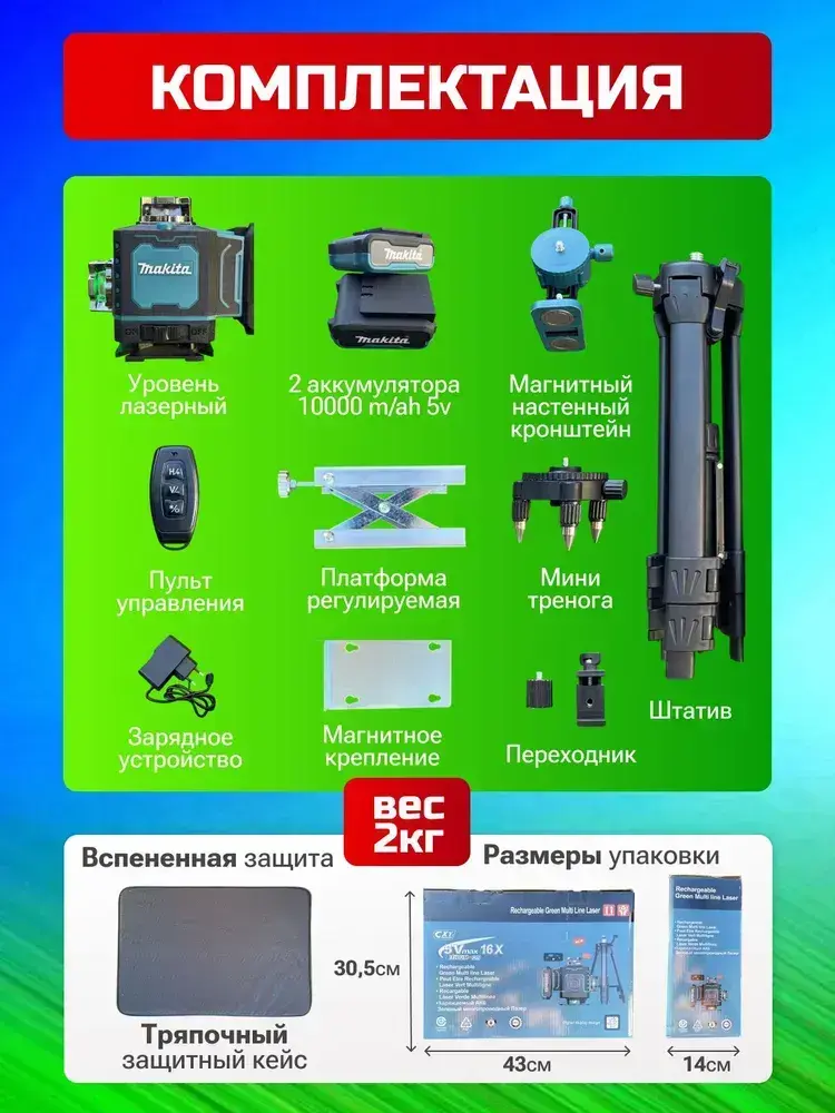 Лазерный уровень нивелир,16 лучей, 2 аккумулятора