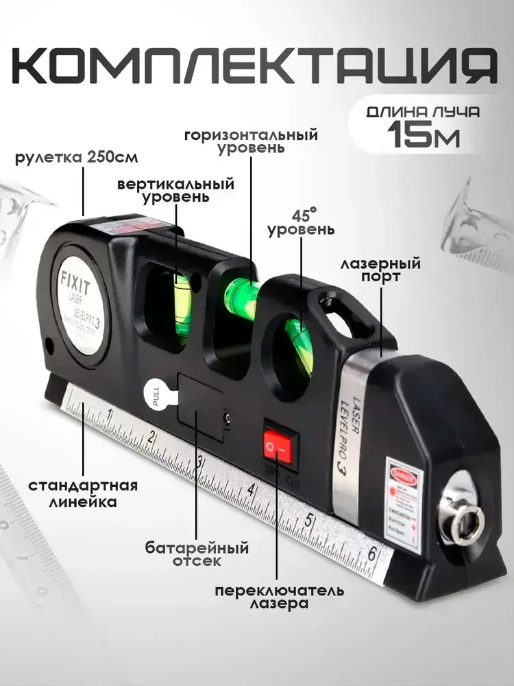 Лазерный уровень строительный Laser Level Pro 3 со встроенной рулеткой 3 метра