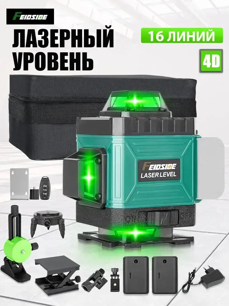 Лазерный уровень,Зеленый луч,4D 16 Линий,2 Батарейки Комплект