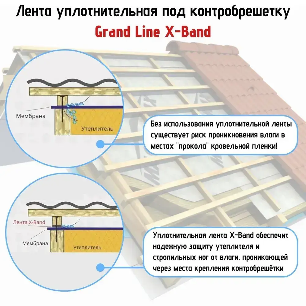 Лента уплотнительная под контробрешетку самоклеящаяся Grand Line X-Band 50мм х 30м х 3мм