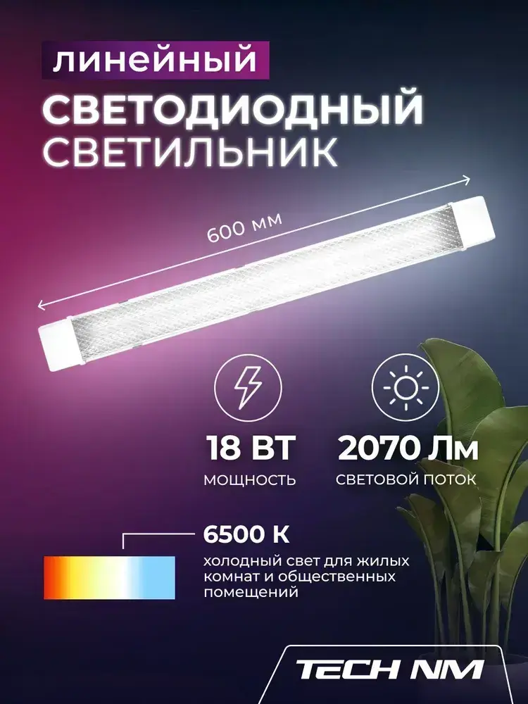 Линейный светильник светодиодный 600мм, Tech NM SMD призма 18Вт, 6500К, лампа для рассады