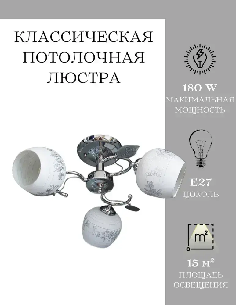 Люстра потолочная MyLight хромированная для всех видов потолков 6993/3 180W, потолочный светильник E27