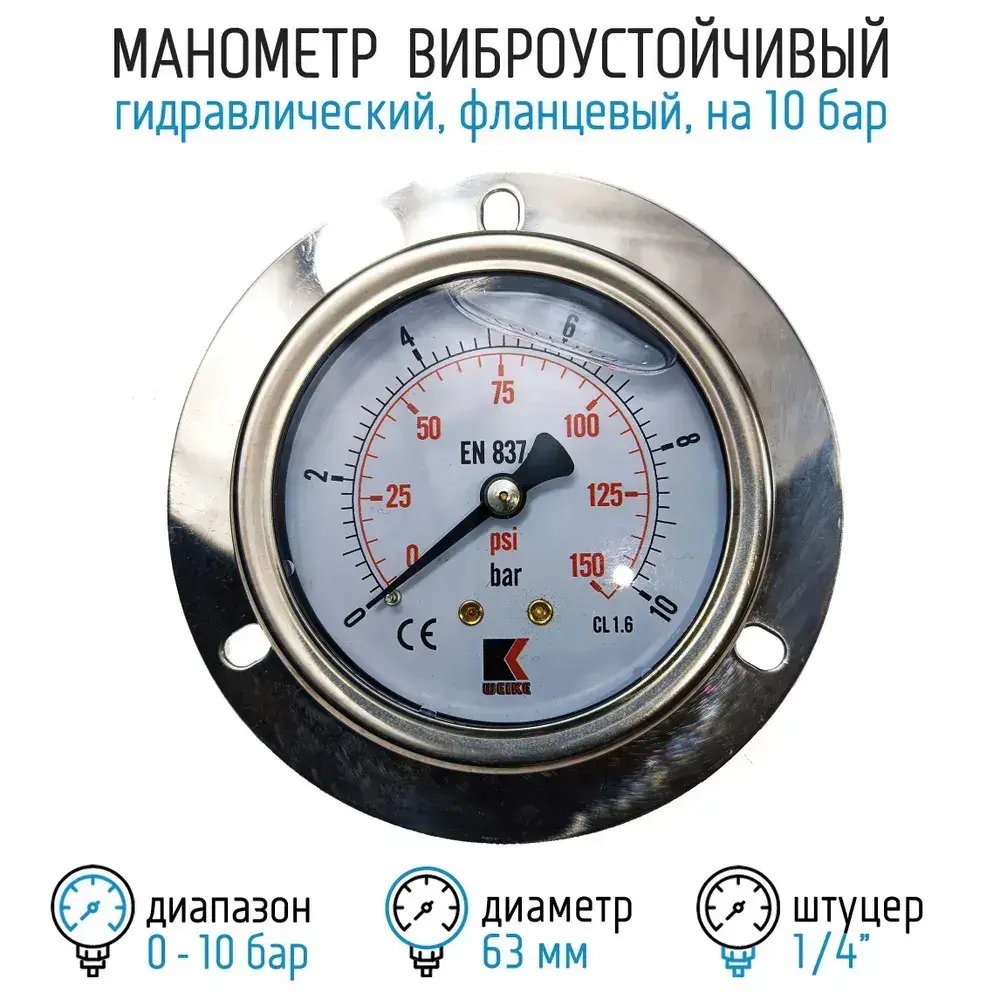 Манометр гидравлический на 10 бар (150 psi), 63 мм, G 1/4" фланцевый, виброустойчивый - глицериновый