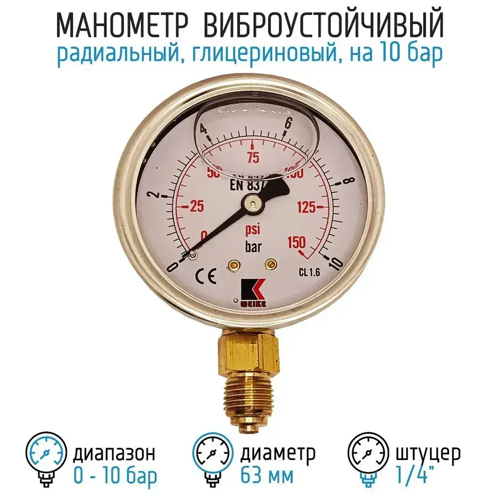Манометр гидравлический на 10 бар (150 psi), 63 мм, G 1/4" радиальный, виброустойчивый - глицериновый