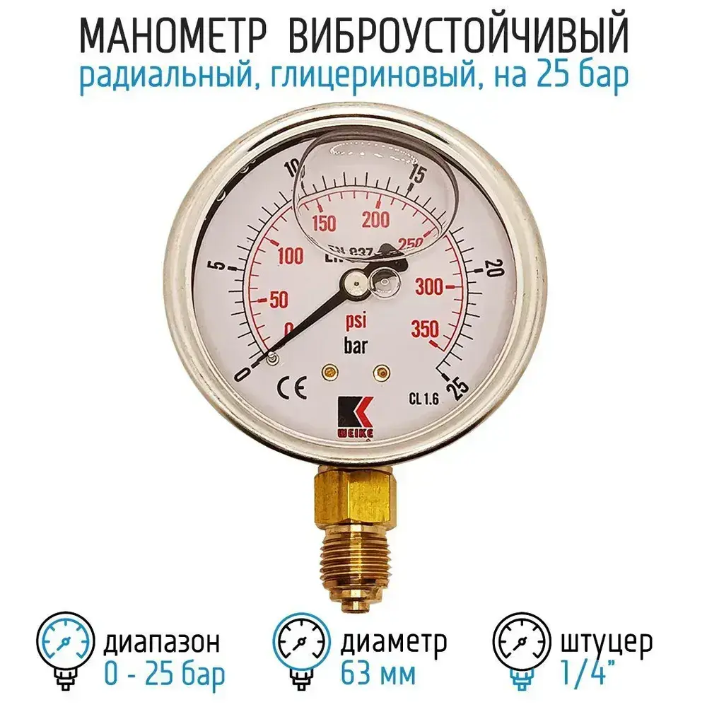 Манометр гидравлический на 25 бар (350 psi), 63 мм, G 1/4" радиальный, виброустойчивый - глицериновый