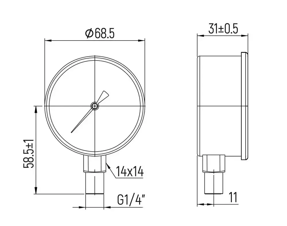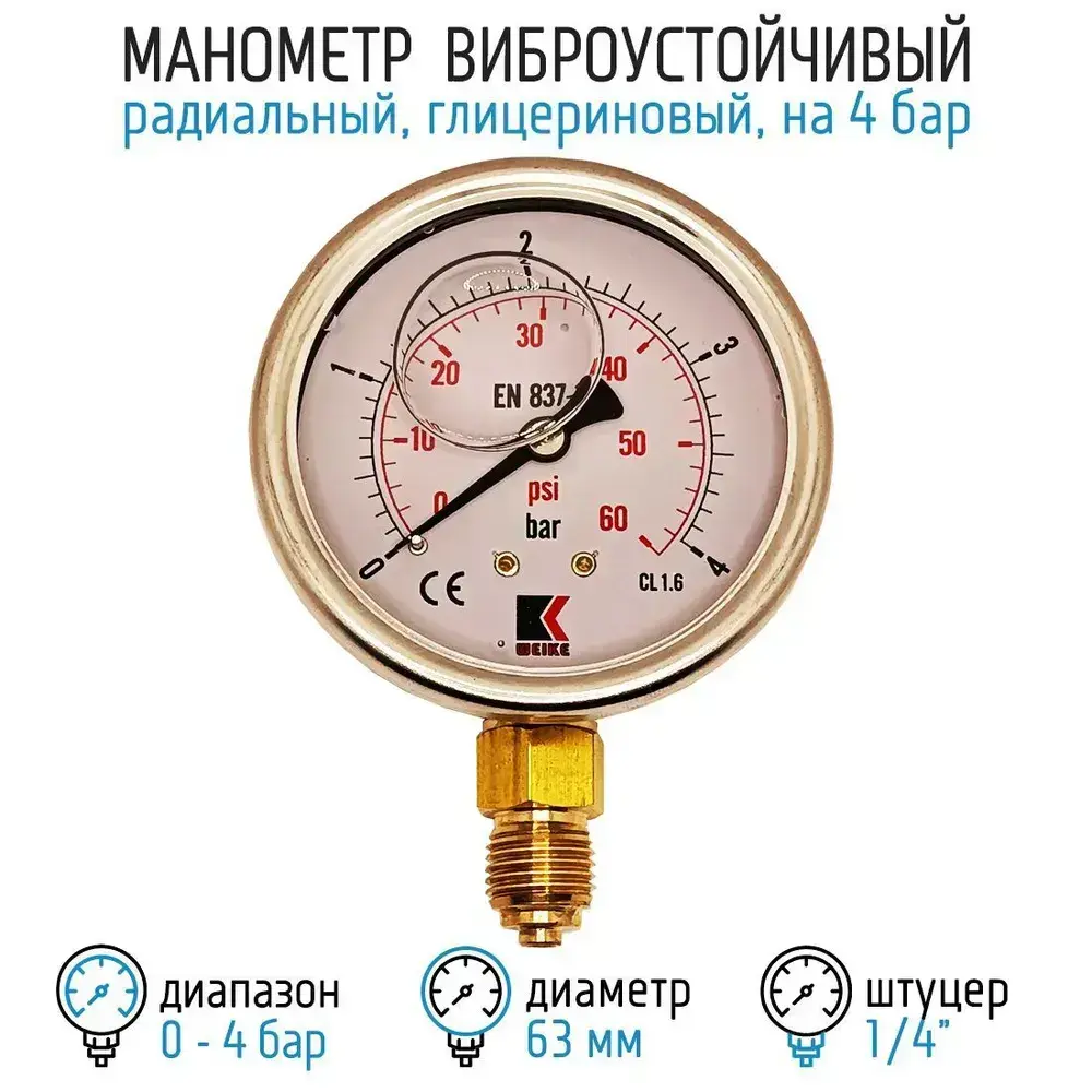 Манометр гидравлический на 4 бара (60 psi), 63 мм, G 1/4" радиальный, виброустойчивый - глицериновый