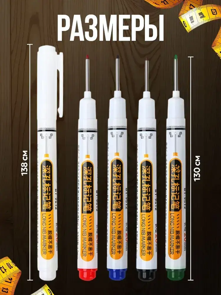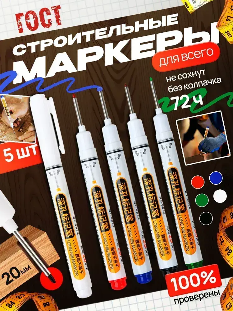 Маркер строительный 5 шт. тонкий разметочный с длинным наконечником - 5 шт. (черный, красный, зеленый, синий, белый). Маркеры строительные набор для разметки по металлу, дереву, стеклу, ткани