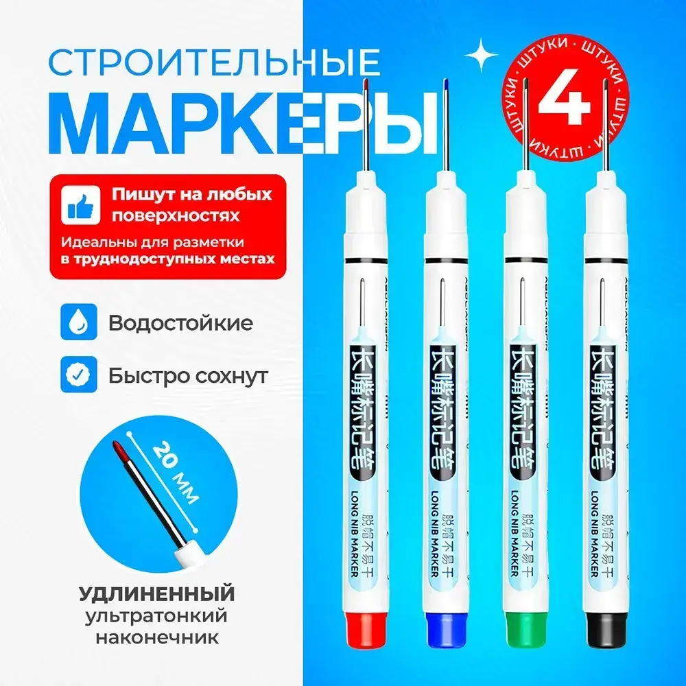 Маркер строительный тонкий разметочный, маркер с длинным наконечником, 4 шт.