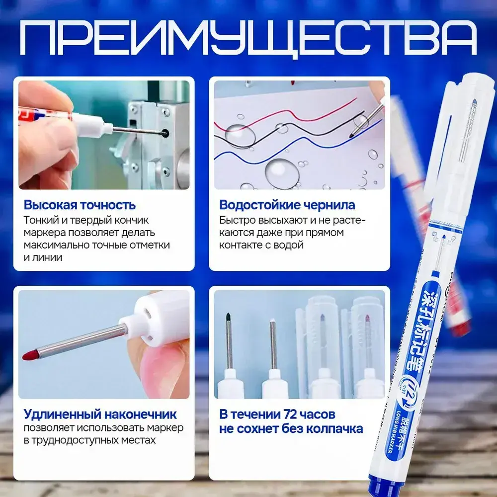 Маркер строительный тонкий разметочный с длинным наконечником / 5 шт (черный, красный, зеленый, синий, белый) / Маркеры строительные набор для разметки по металлу, дереву, стеклу, ткани