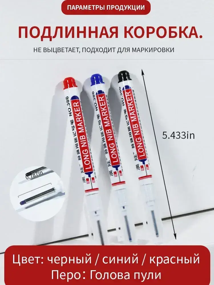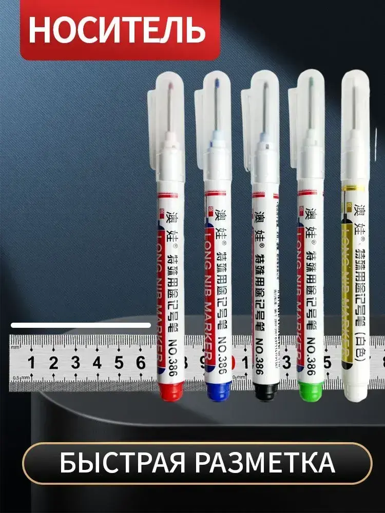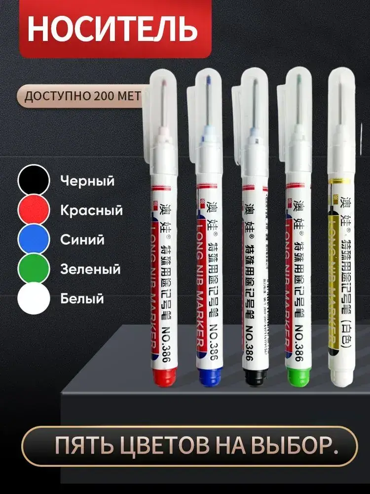 Маркер строительный тонкий разметочный с длинным наконечником 5 шт (черный, красный, зеленый, синий, белый) Маркеры строительные, набор для разметки по металлу дереву стеклу ткани
