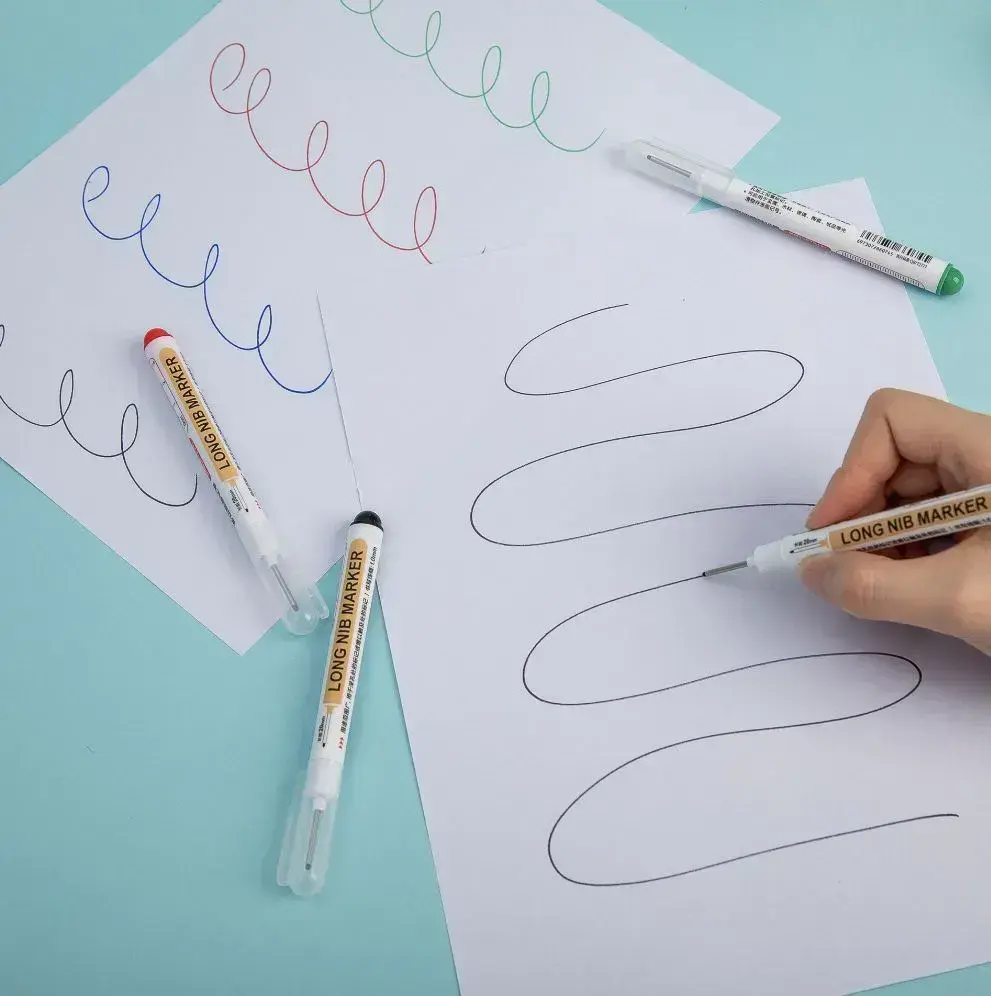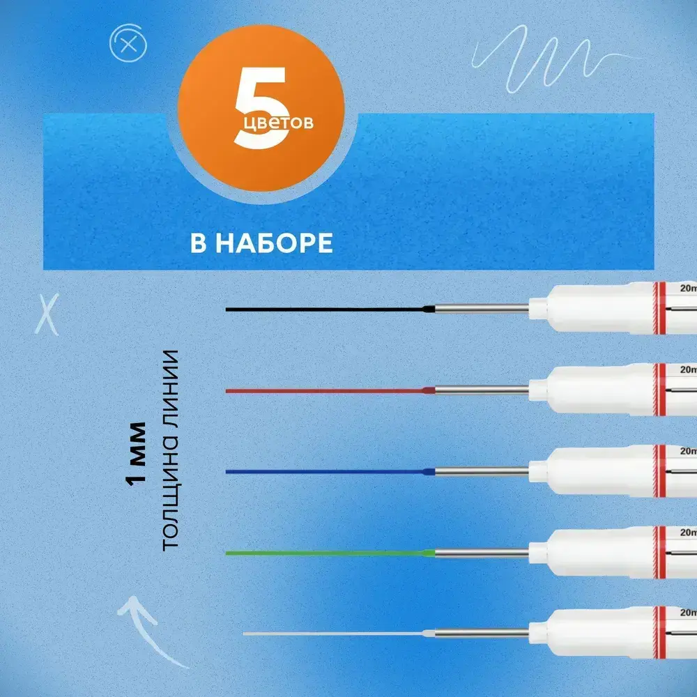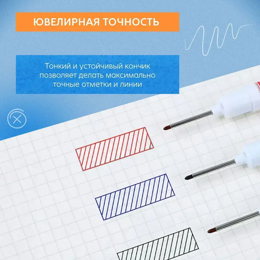 Маркер строительный тонкий разметочный с длинным наконечником / 5 шт (черный, красный, зеленый, синий, белый) / Маркеры строительные набор для разметки по металлу, дереву, стеклу, ткани перманентный