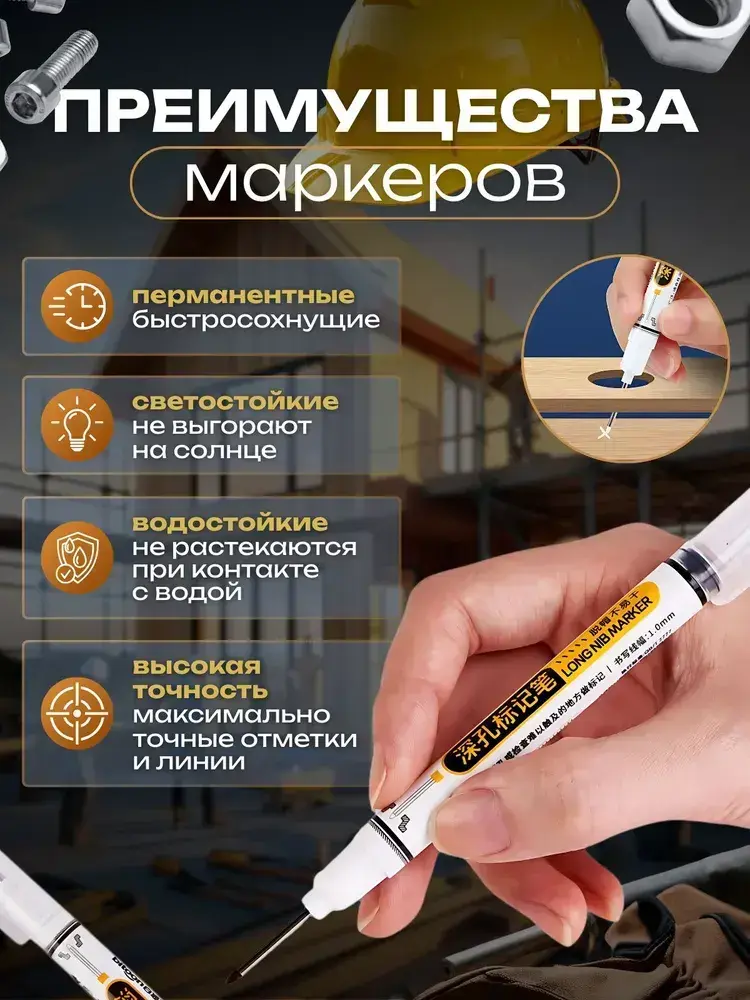 Маркер строительный тонкий разметочный с длинным наконечником 5 штук / маркеры строительные, набор для разметки по металлу, дереву, стеклу, ткани