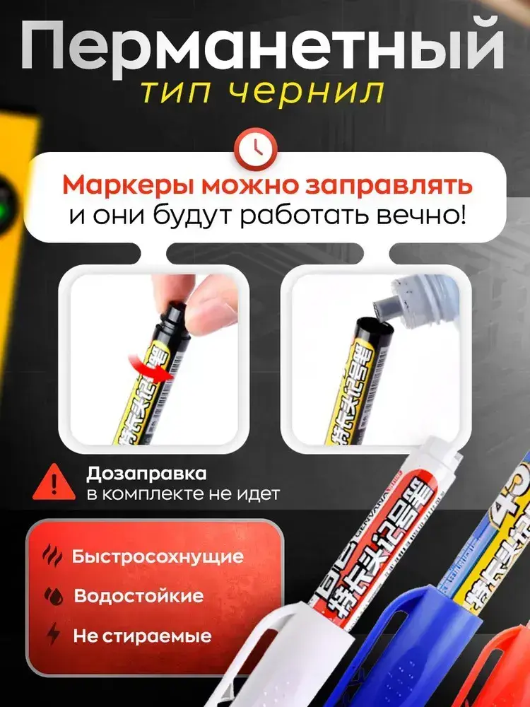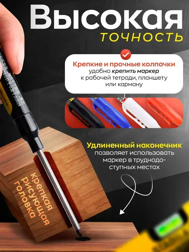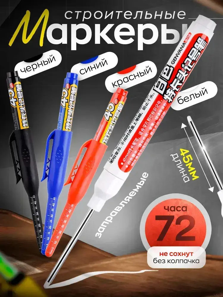 Маркер строительный тонкий разметочный водостойкий с длинным наконечником белый черный синий красный, набор маркеров 4 цвета 4 штуки