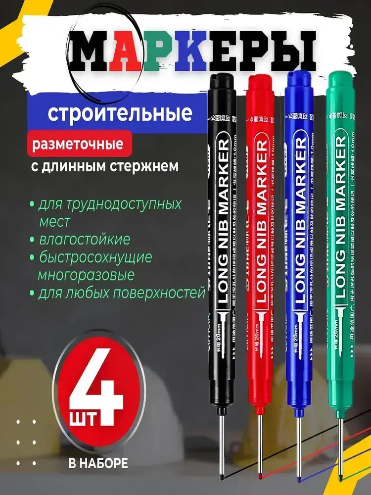 маркер строительный тонкий с наконечником 20мм, набор 4 шт