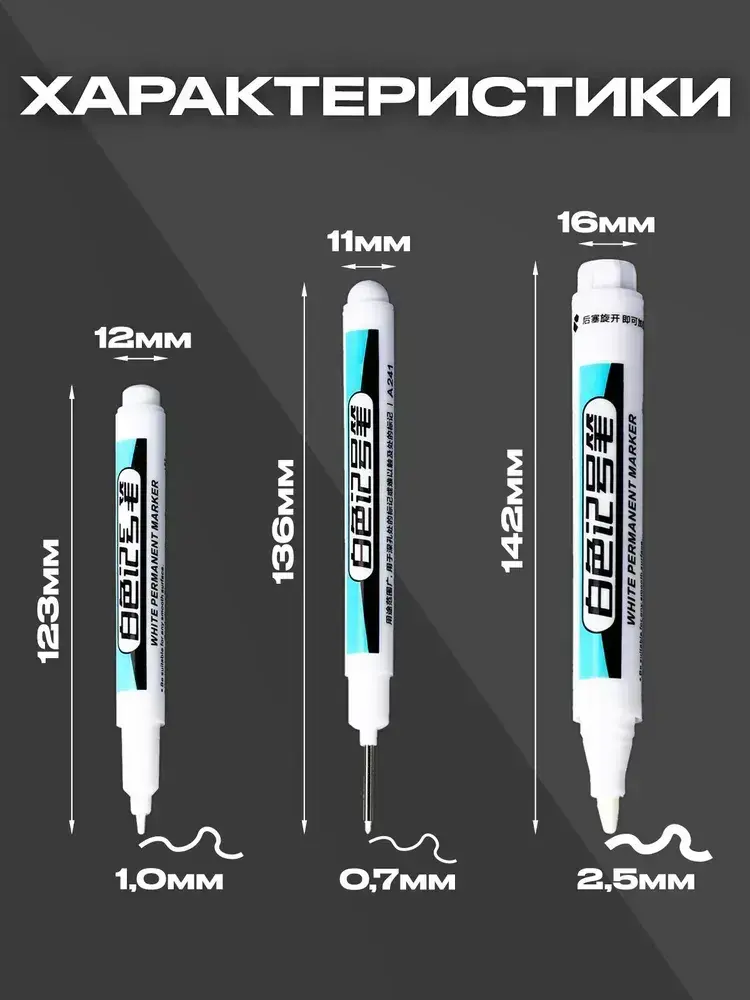 Маркеры строительные тонкие разметочные по металлу белые, с длинным и коротким наконечником ,набор - 3 шт. белые, толщина линии 0,7мм, 1мм и 2,5мм.