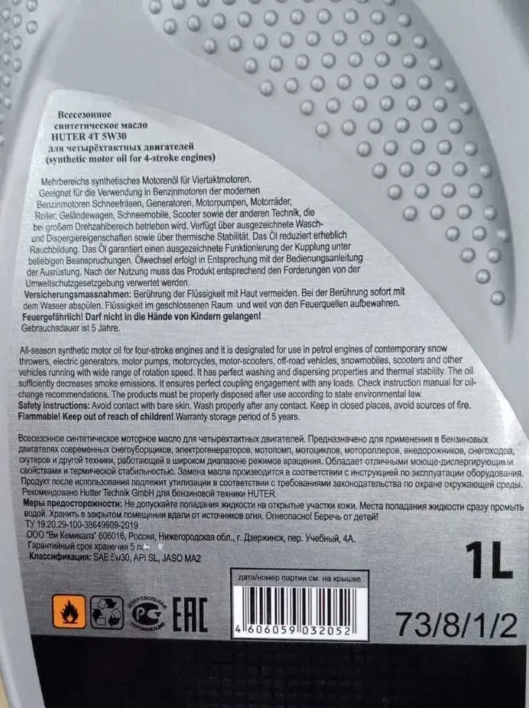 Масло моторное синтетическое 5W-30 HUTER 1л всесезонное для 4Т двигателей