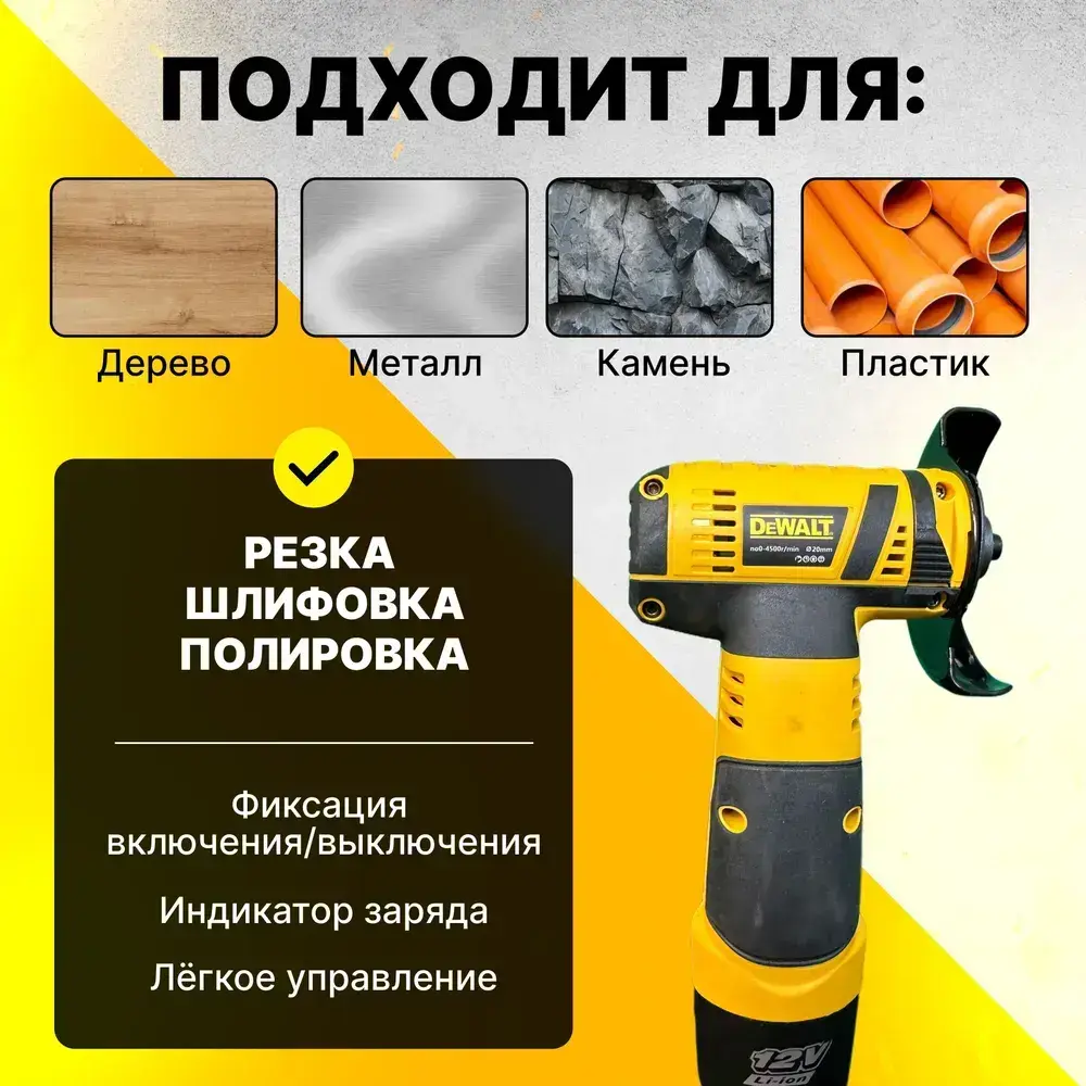 Мини-угловая шлифовальная машина DEWALT. Беспроводной двигатель, 2 АКБ 12В 2 Ач
