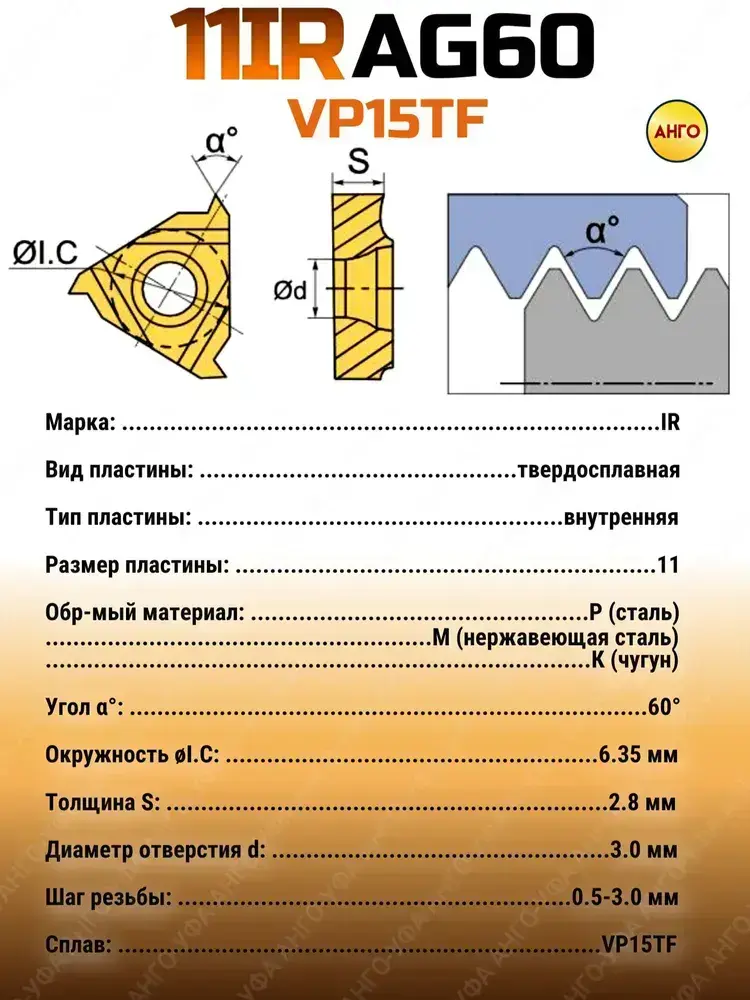 MMT 11IR AG60 VP15TF пластина резьбовая твердосплавная / 5 штук / для нарезания внутренней резьбы Угол 60 градусов ANGO-UFA