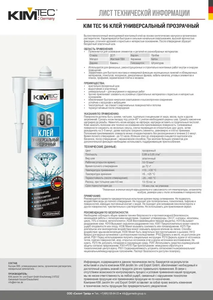 Монтажный клей KIM TEC 96 универсальный кристально-прозрачный, 280мл