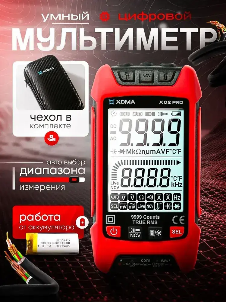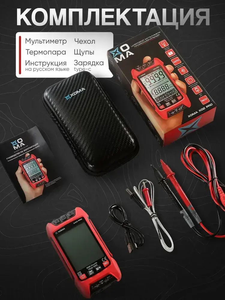 Мультиметр цифровой автоматический с щупами, чехлом и термопарой умный XOMA X02 PRO, работа от аккумулятора
