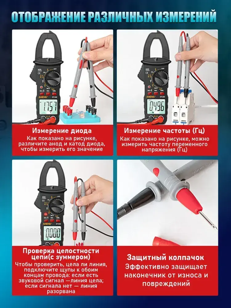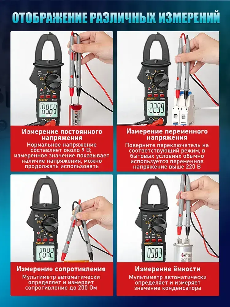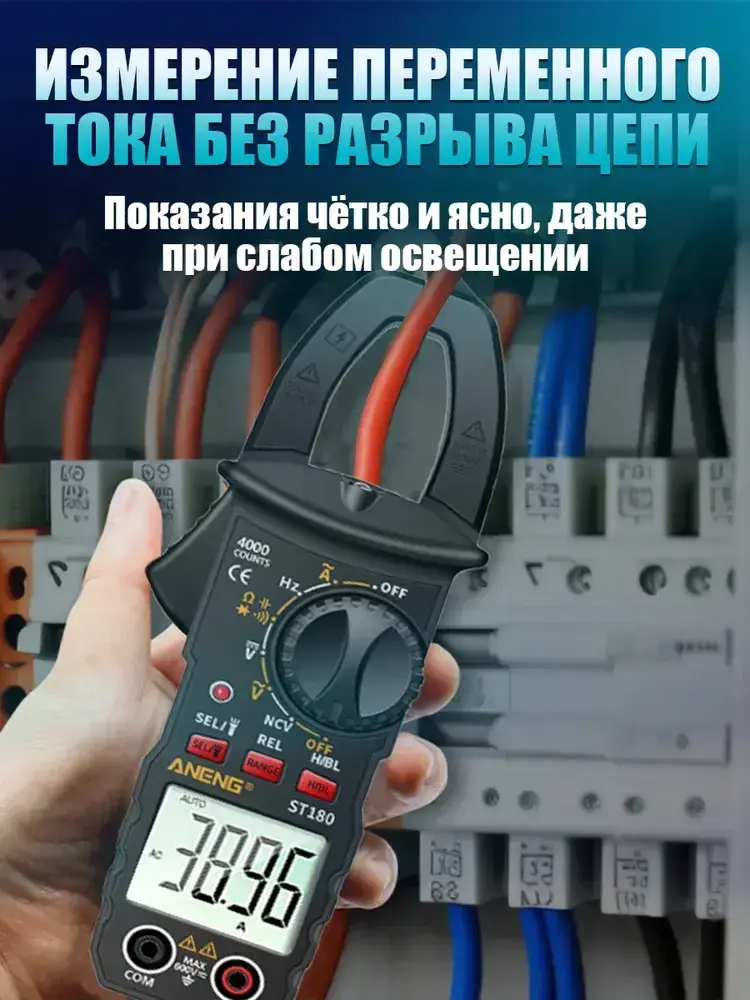 Мультиметр цифровой с прозвонкой автоматический, мультиметр автомобильный, 4000 отсчетов, тестер электрический, токовые клещи, измерение без разрыва цепи, с фонариком и дисплеем и щупами