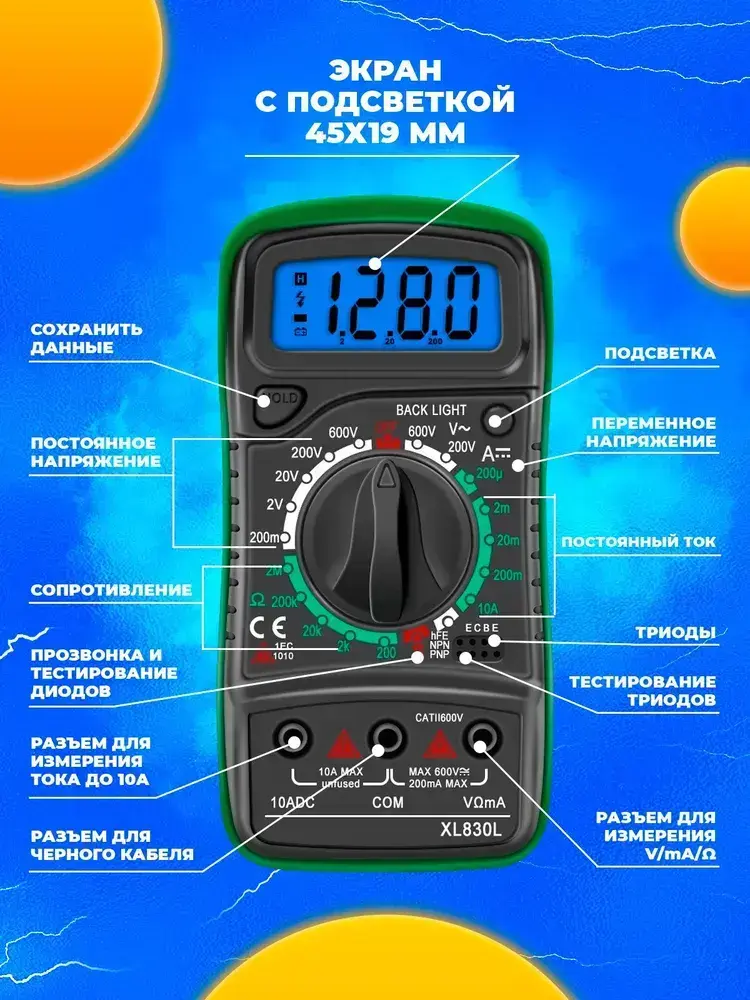 Мультиметр цифровой тестер электрический автомобильный с функцией прозвонки цепи