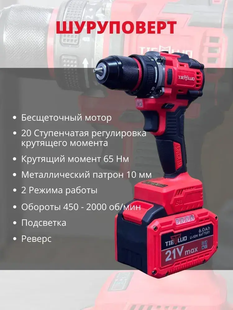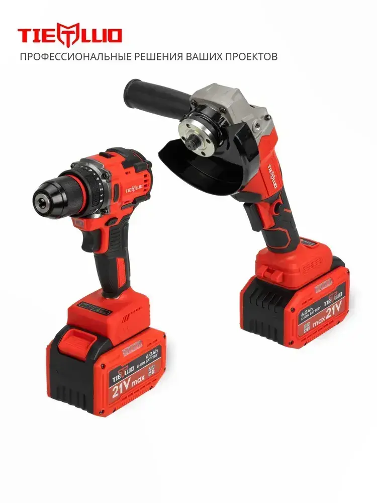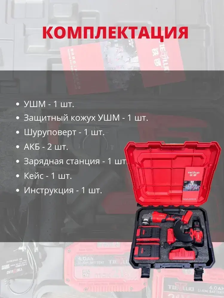 Набор 2в1 аккумуляторного инструмента TIELLIO УШМ, шуруповерт бесщеточные 2 АКБ LI-ION, 6ач