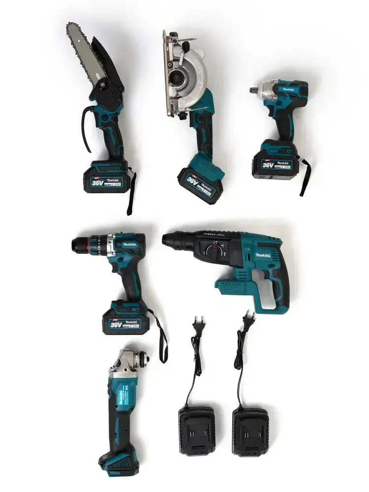 Набор аккумуляторных инструментов 6в1 Шуруповерт Болгарка Гайковерт Винтоверт Перфоратор Лобзик Циркулярная Пила