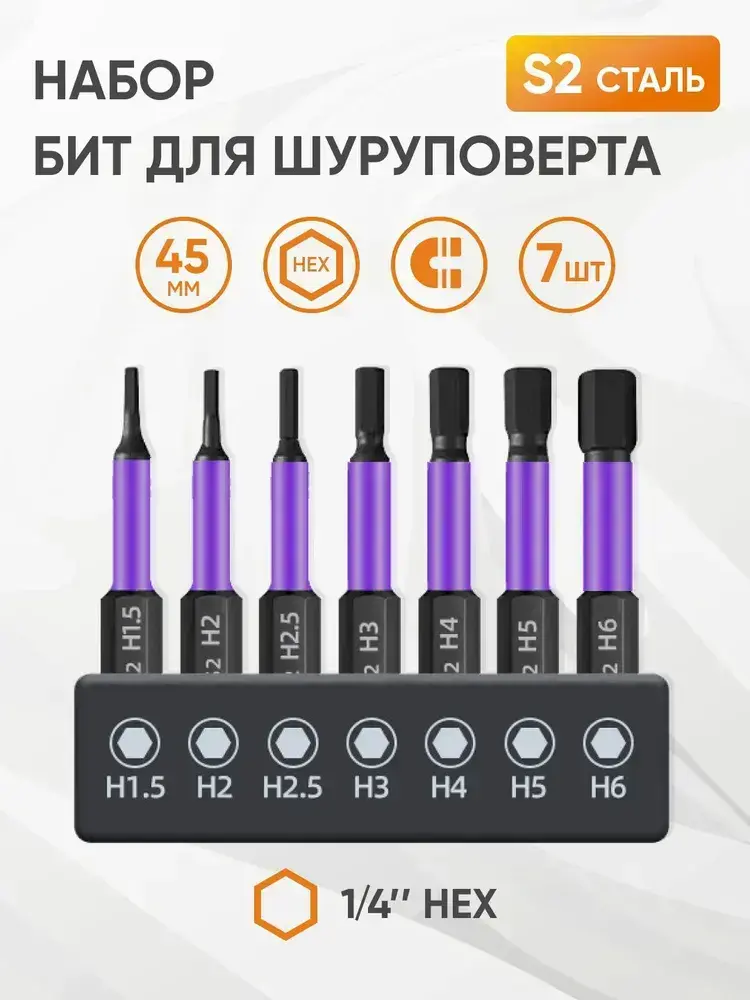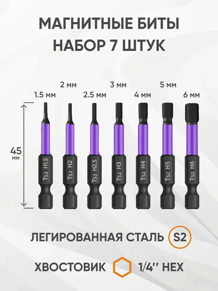 Набор бит для шуруповерта и отвертки шлиц HEX. Магнитные биты E1/4 S2, H1.5, H2, H2.5, H3, H4, H5, H6